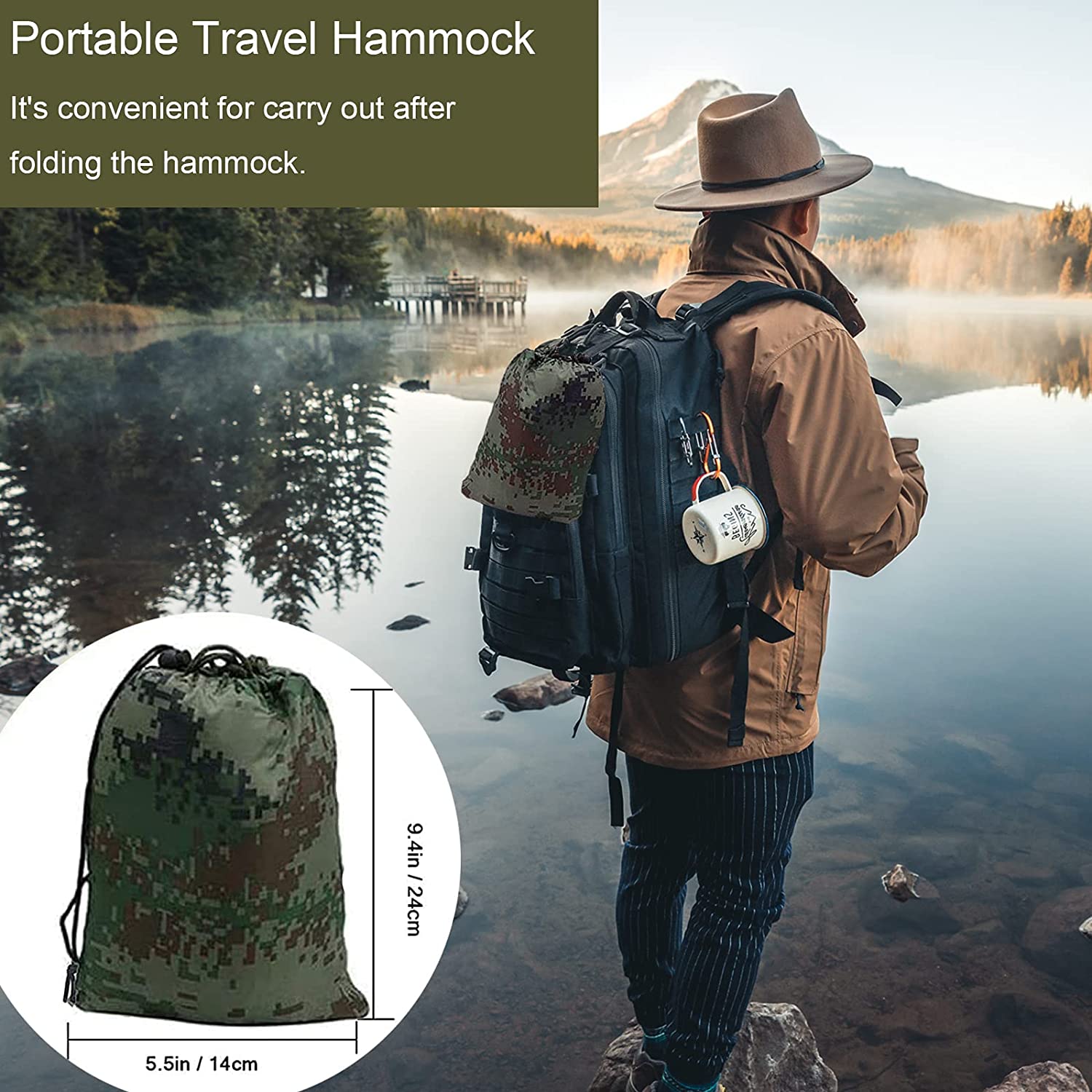 - 🌅Light Weight & Portable: This backpacking Hammock weighs only 1.4 lbs, you can take it anywhere. It can be storage in a small bag (5x5x9 inch) for maximum portability. When you take the hammock out, this bag also can be used to store small items.