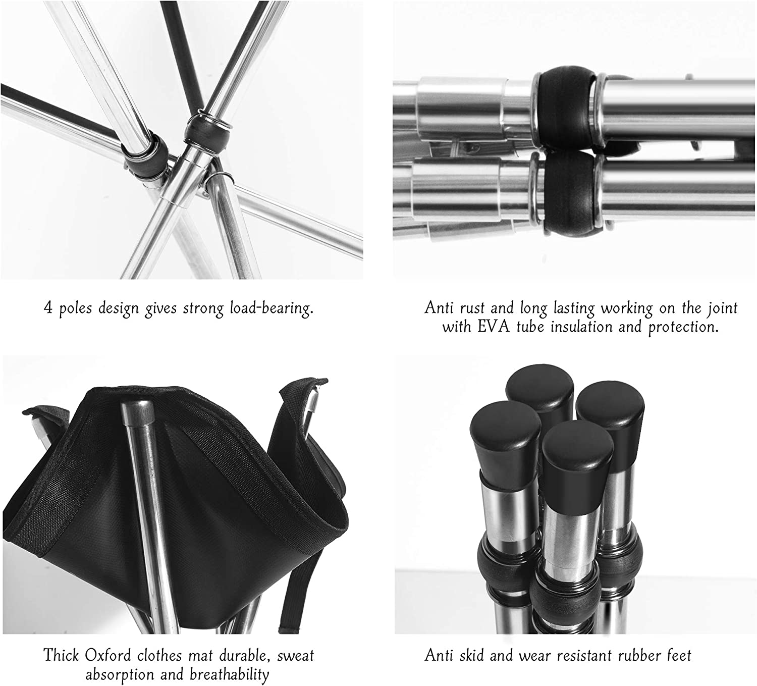 • 🏕️ QUICK SETUP OUTDOOR STOOL---- Quick setup and fold down in 10 seconds. No technique or tool is required. Pop open this camping stool then extend four feet out. Anti-rubber feet allow you to use them anywhere. Place the stool on the ground and you'll be ready to rest comfortably whenever you need!