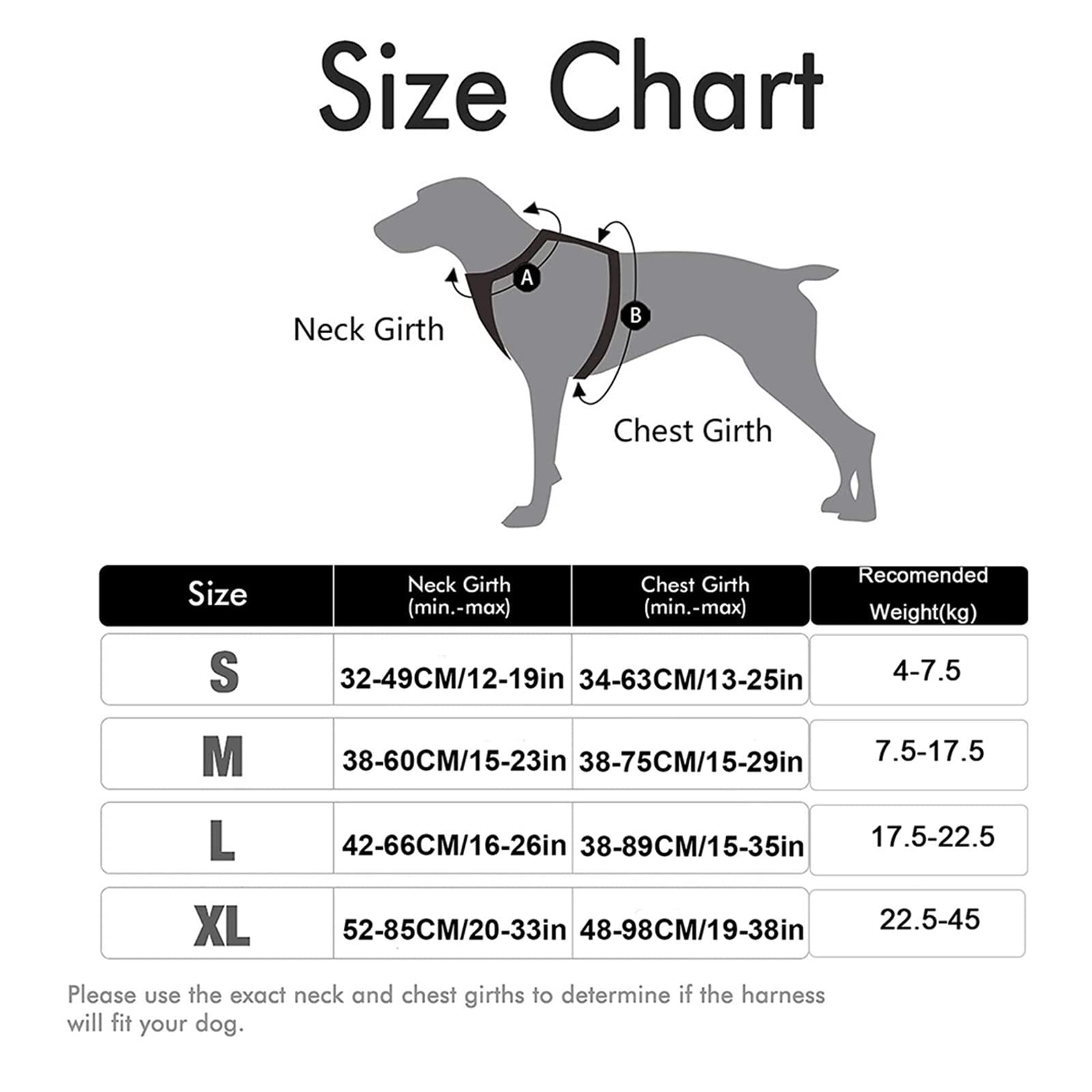 - 【Adjustable Dog Harness】 We provide different size harnesses for small dogs to large dogs to ensure your dog a comfortable experience.Recommended Breeds:Golden Retriever, Huskie, Labrador, Alaska, German Shepherd, Akita, etc. Note: Please measure your dog's chest girth carefully and check our measuring guide before purchasing.If your dog fits two sizes in the list, always choose the larger one.
