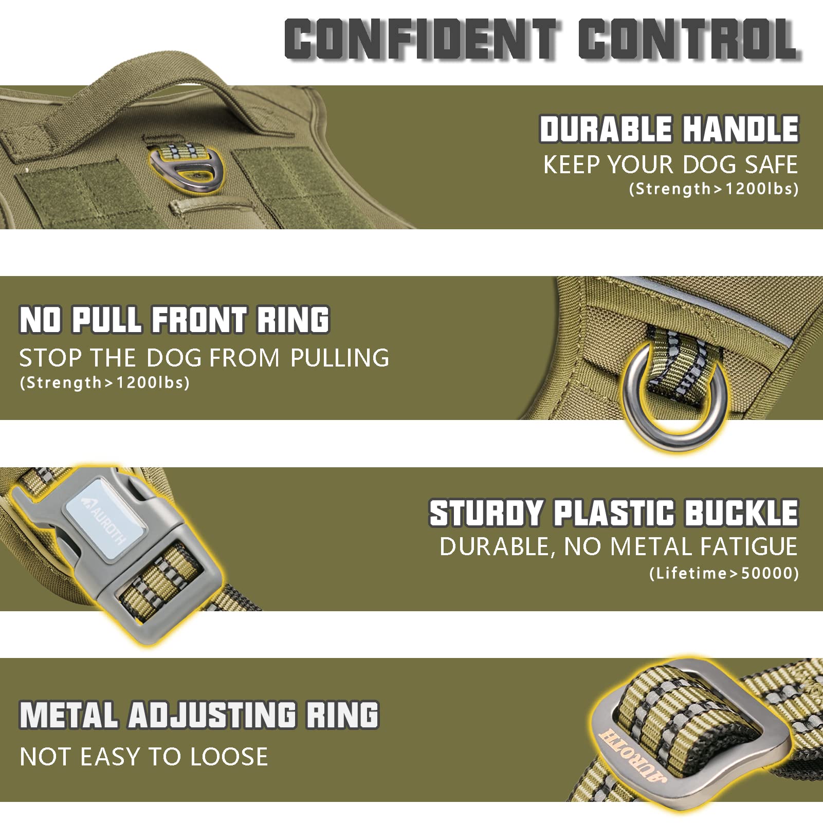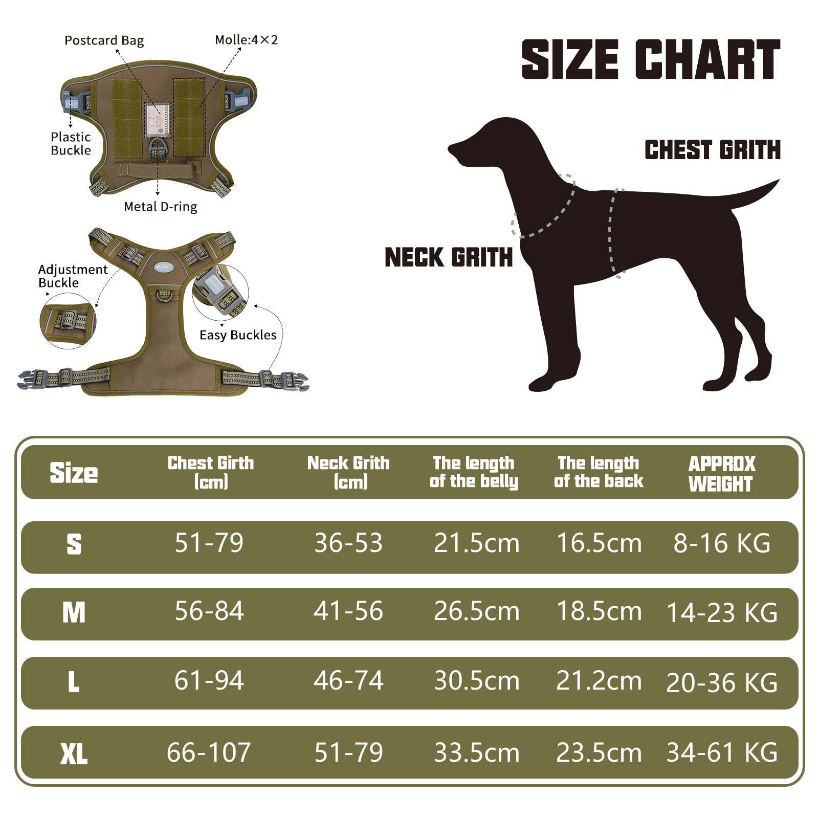 - [Anti Pull Dog Harness]: Our Tactical Dog Harness has 2 D-shaped rings on the chest and back. Once your dog rushes forward, you can pull the front ring to control it. When you walk with your dog, the ring on the back provides less stress on its neck.