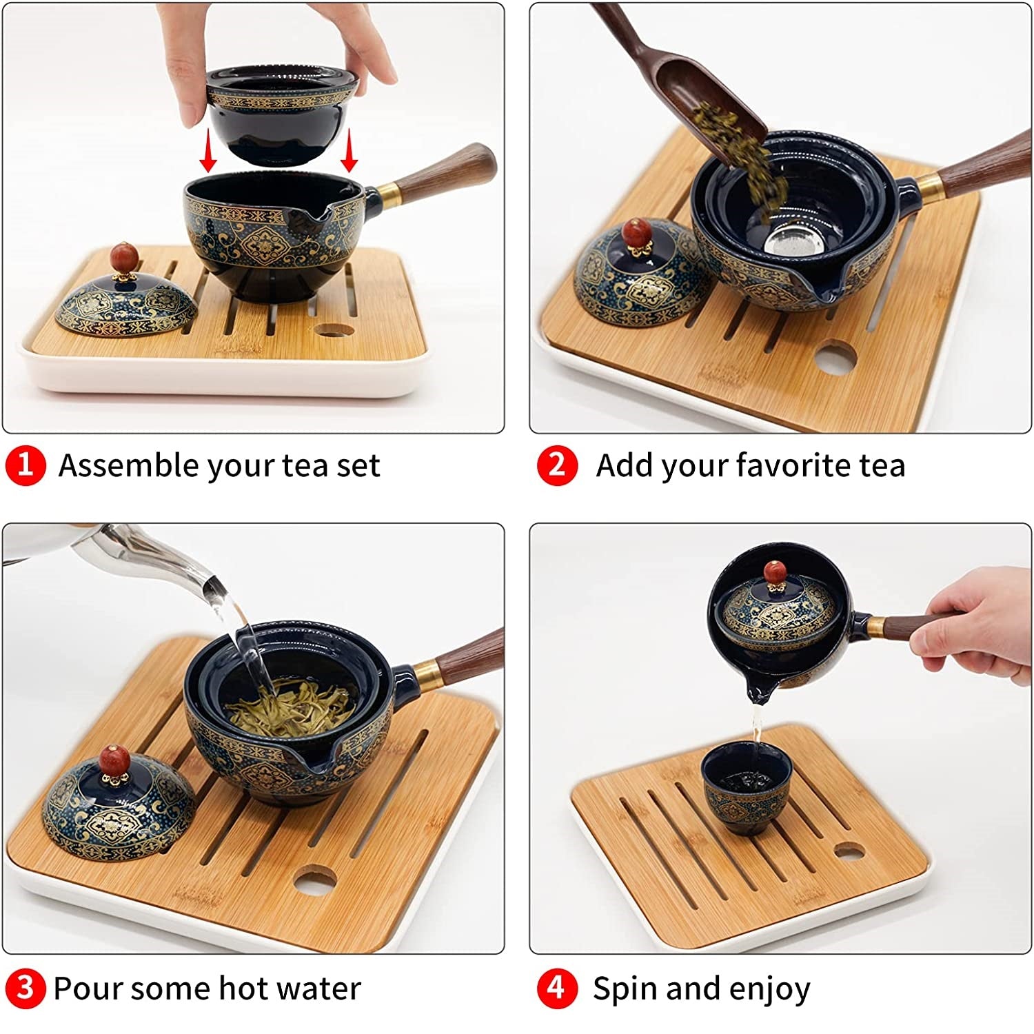 • Patented Distinctive Design: Officially licensed product. Tired of "just brewing and pouring" your lovely tea in the same way? Let's try this unique Chinese tea set and find out extra leisure from it. Unlike common teapot sets on the market, this rotatable teapot set defines a new look of kungfu tea, hold the handle and spin it, as a lazy tea set, you don't have to take the strainer out, enjoy a mixed spiritual sense of gongfu and tea and a special experience tea time with friends.